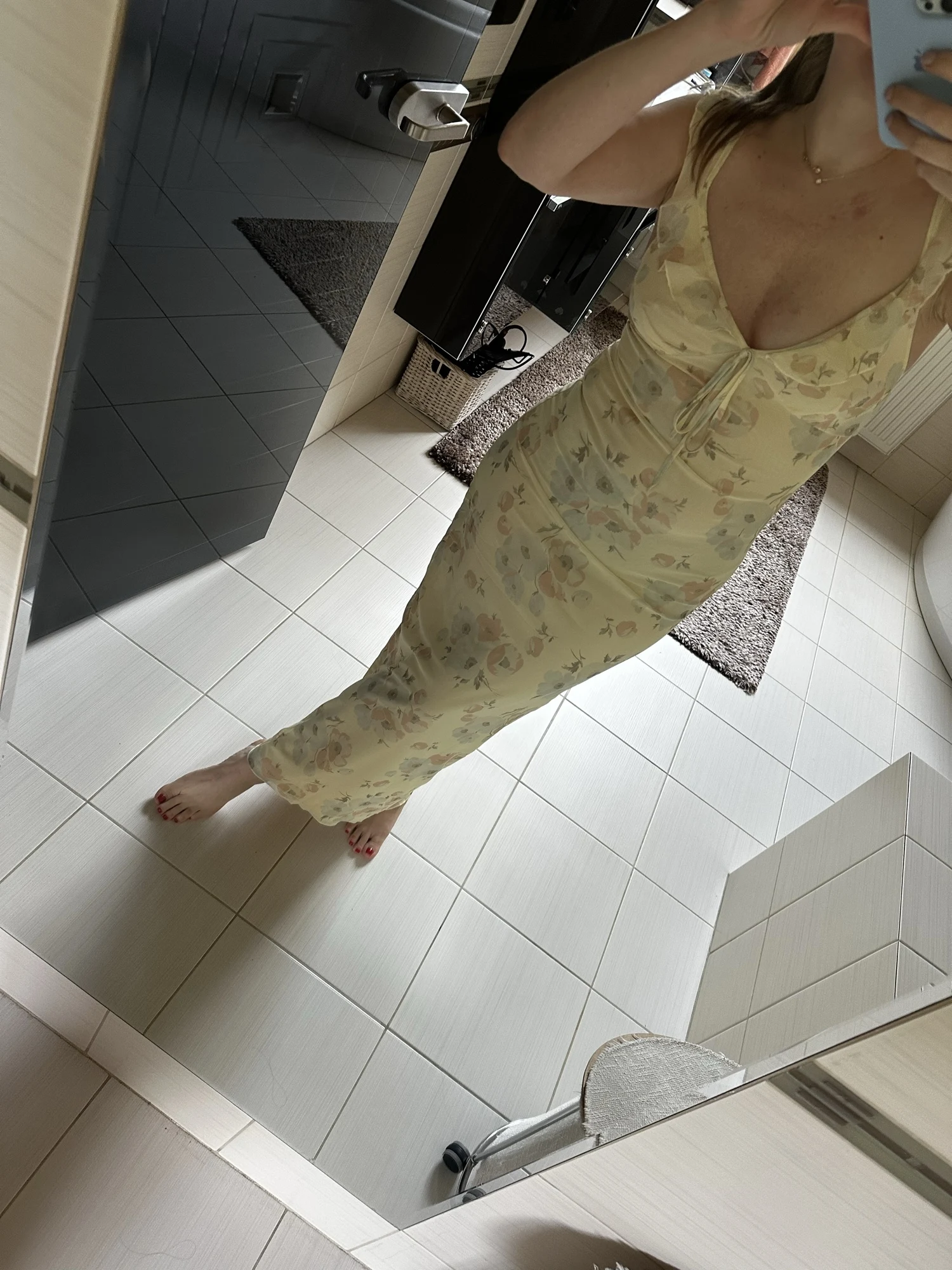 The fabric feels pleasant to touch and stretches well. There is a lining that gently touches the skin. For my height of 174cm, size M fits up to the floor. I recommend it!